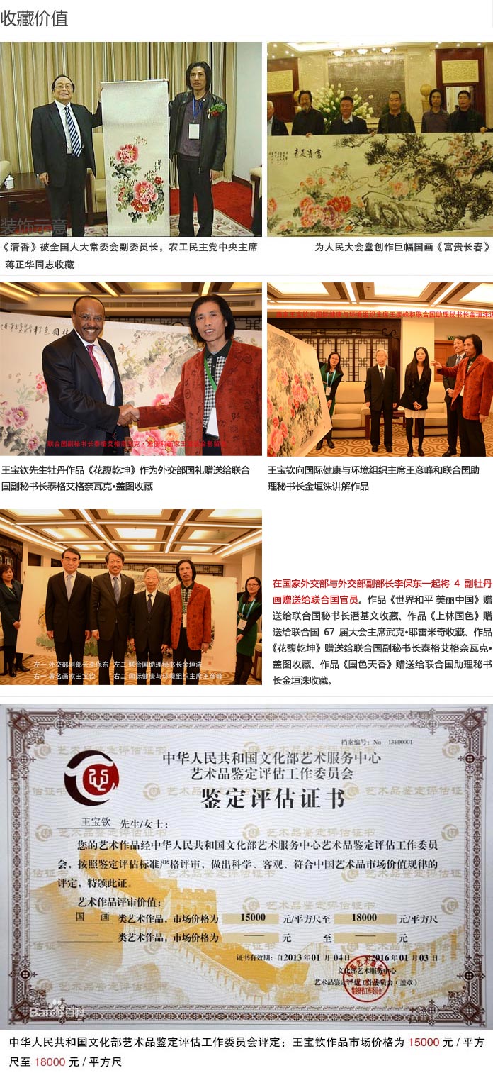 2005年參加全國新聞人物表彰大會,為大會獻出巨副佳作《牡丹圖》受到全國政協副主席張克輝,全國人大常委會副委員長布赫等中央領導的高度評價,被人民大會堂收藏并譽為“ 中原牡丹王 ”,同時又榮獲了“ 全國百佳新聞人物優秀文化工作者 ”稱號。人民日報社領導為牡丹圖題“ 百花園里最瑰麗,大會堂中展風采 ” 。作品《富貴吉祥》被編入《中國書畫作品集》,《情趣》被編入《中國當代書畫家收藏大典》,《國色天香》被編入《中華魂》,《富貴滿堂》、《細雨和風》等作品入編《中國當代名流研究》 。《牡丹圖》、《花鳥條屏》先后被美國、加拿大、新加坡、馬來西亞、香港等國內外知名人士珍藏。