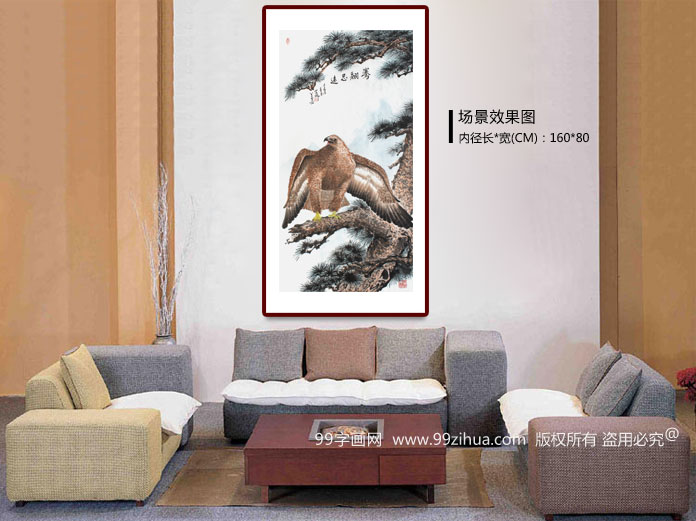 【作品簡評】騫翮思遠(qiān he si yuan):意思是形容志向遠大,像雄鷹一樣振翅高飛,凌空而起。此幅松鷹圖《騫翮思遠》,是蒲家瑞老先生于82歲作,古松蒼勁挺拔、松針疏密得當,松干老而勁健,雄鷹長嘴尖爪,半張開著翅膀,準備高飛而又停止的狀態,在作者筆下展現的淋漓盡致,恰到好處,同時,也在激勵后人要有雄鷹一樣的宏圖,直追成功之路,此幅松鷹圖掛在辦公室有前途宏亮、業績猛增之寓意,掛于書房勵志發憤圖強、大展宏圖之意。