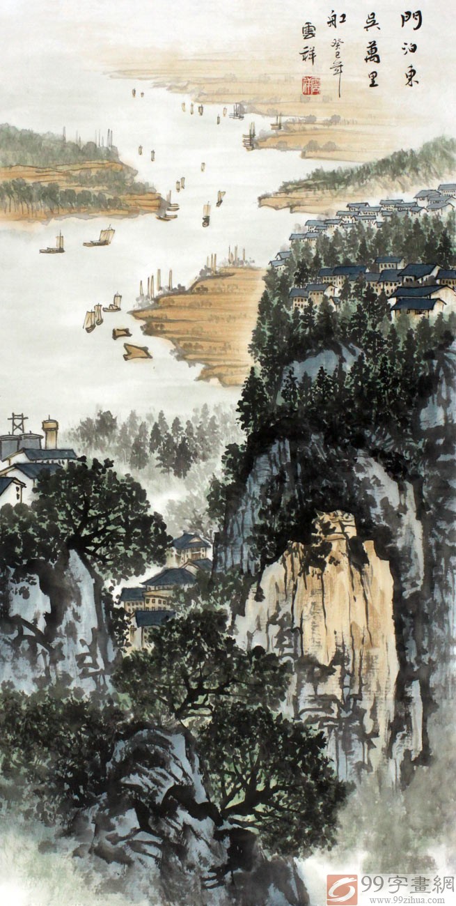 杜云祥先生的這幅國畫山水《門泊東吳萬里船》,構圖講究,意境深邃,座座房屋立于山間,在這秀雅而又寂靜的山間可以靜享此美景,從窗口透過可以看見門外停泊著從遙遠的東吳來的船只,它 們緩緩地向前滑行,流向另一方彼岸。縱觀此幅畫作,如親自游玩一樣暢游而又無阻,是一幅大氣山水畫作,推薦選購裝飾!